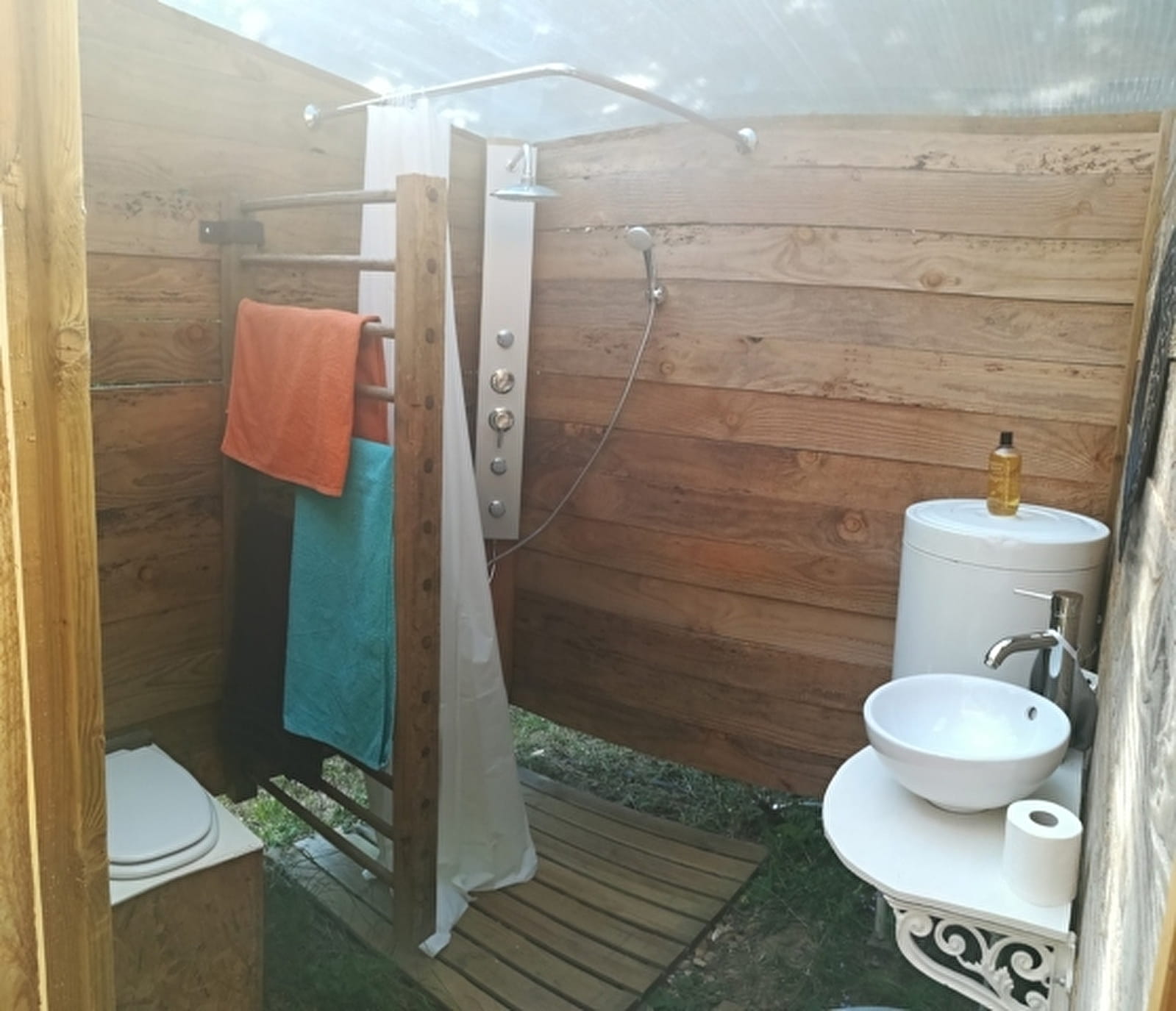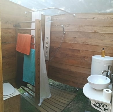 Une cabane en bois attenante comprend toilette sèche et salle de bain